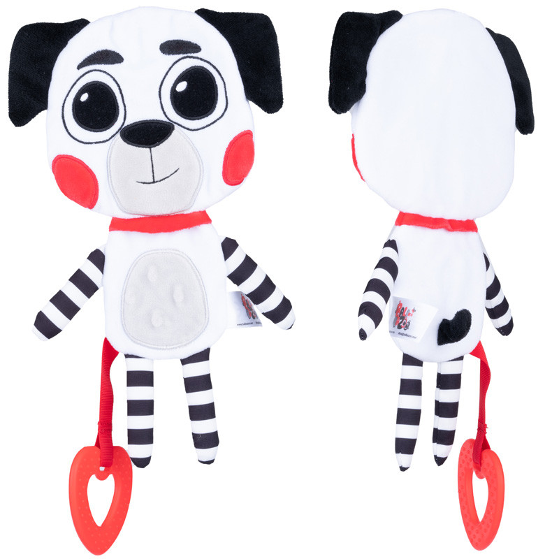 A puha anyagból készült kutya barátságos megjelenése és különböző textúrái ösztönzik a babákat a felfedezésre, míg a beépített rágóka segít a fogzási kellemetlenségek enyhítésében.