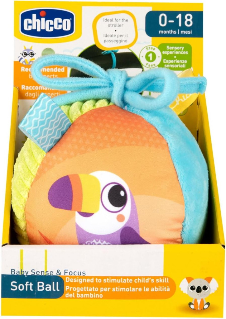 Babakocsira ideális játék. Puha labda különféle kiváló minőségű anyagokból: könnyű és könnyen megfogható.
