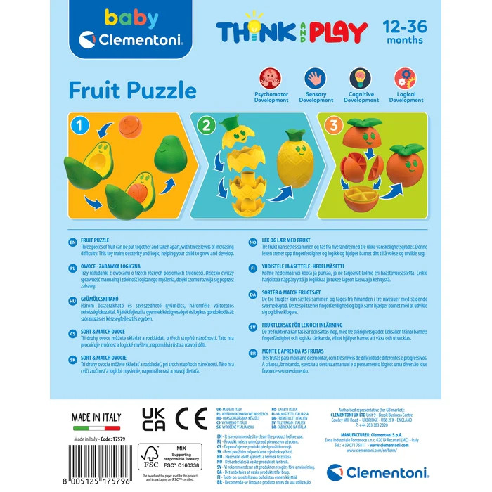 Ez a vidám, fejlesztő gyümölcsös logikai puzzle tökéletes választás a legkisebbek számára, akik játék közben szeretnék felfedezni a formák, méretek és sorrendek világát! A Clementoni Think&Play sorozat gyümölcsös változata három aranyos figurát – ananászt, avokádót és mandarint – tartalmaz, melyeket darabonként lehet összeilleszteni a megfelelő sorrendben. A játék célja, hogy a gyerekek logikusan gondolkodva egymásra illesszék a gyümölcsök részeit, így fejlesztve finommotorikájukat, szem-kéz koordinációjukat és problémamegoldó képességüket.