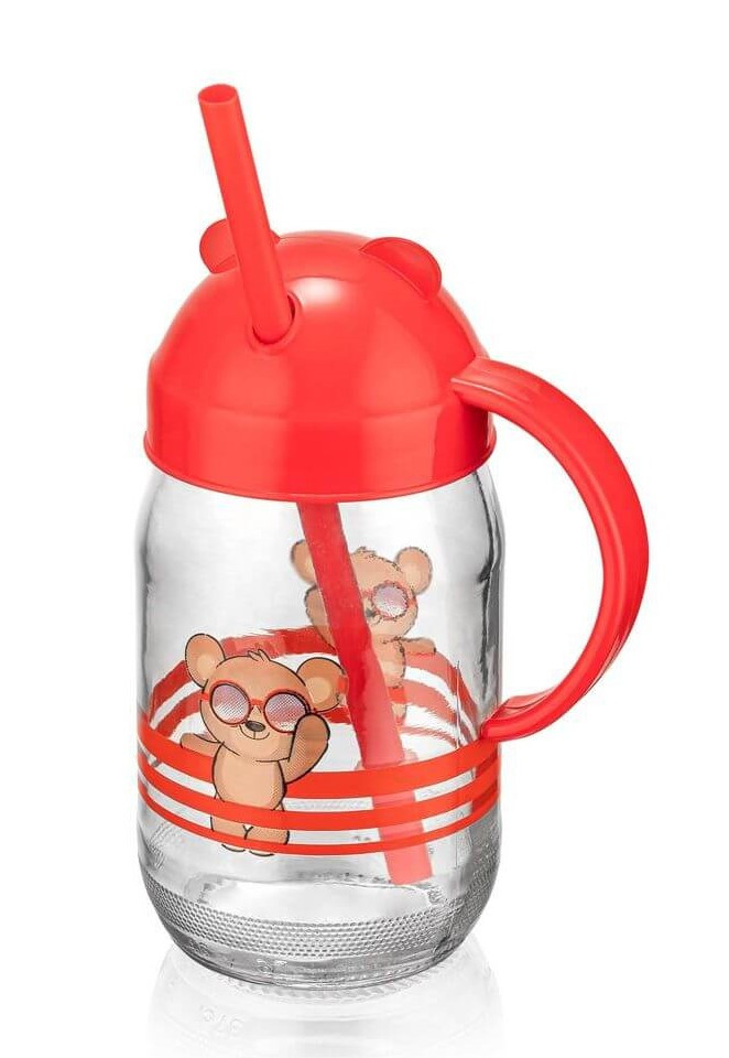 QLUX szívószálas üvegpohár 370ml - Teddy piros