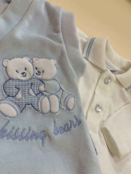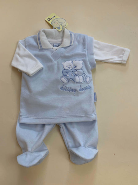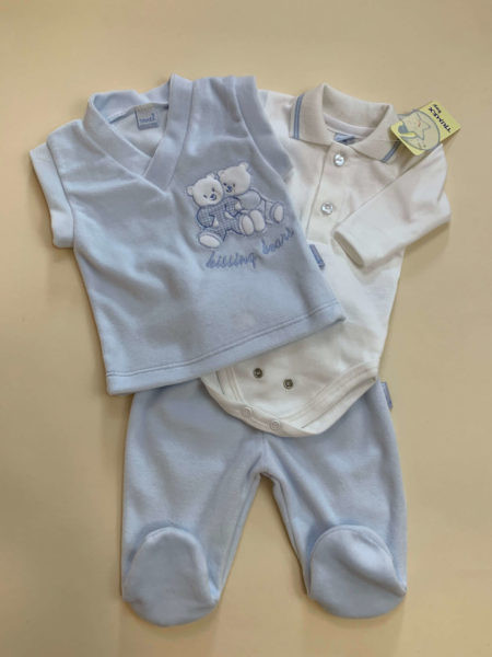 Kisfiúknak plüss belebújós mellény hímzéssel,kétméretes, galléros pamut hosszú ujjú kombidressz és plüss derekas, lábfejes nadrág.