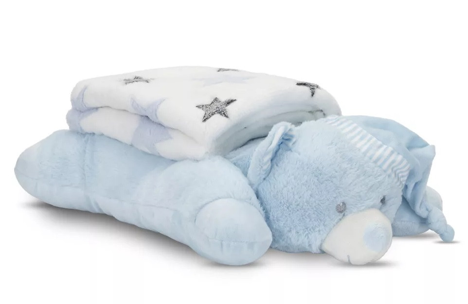 Pihe-puha takaró, aranyos állatos párnával. Tökéletes ajándék az újszülöttek számára, akár babaváróra.